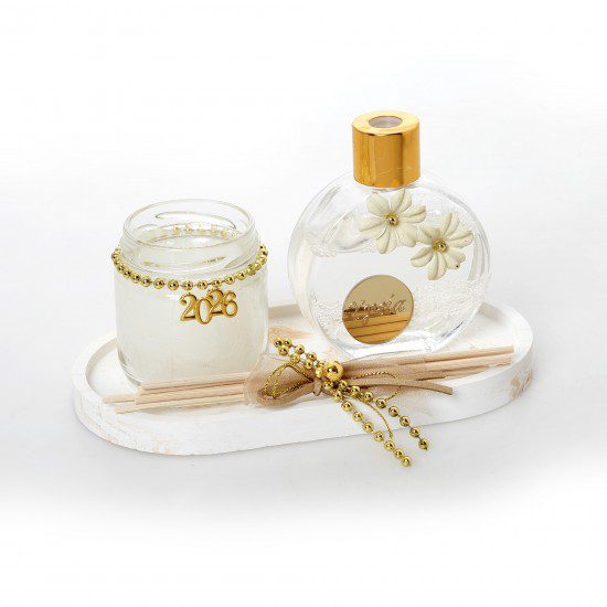 Κεραμική βάση διακοσμημένη με αρωματικό χώρου και ευχή σε χρυσό plexiglass “Υγεία”, που συνοδεύεται από κερί.