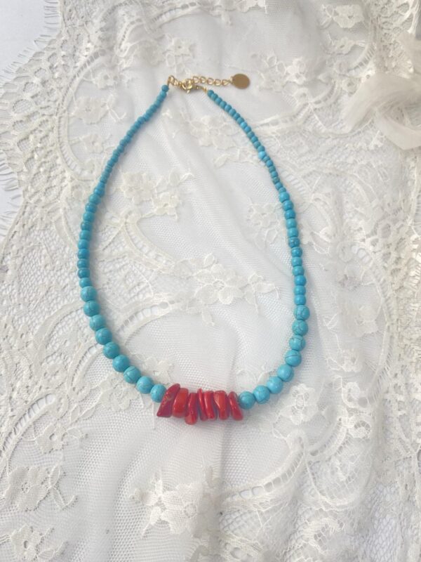 Χειροποίητο κολιέ με ημιπολύτιμες πέτρες Χαολίτη σε διαφορετικά μεγέθη & Κοράλλι